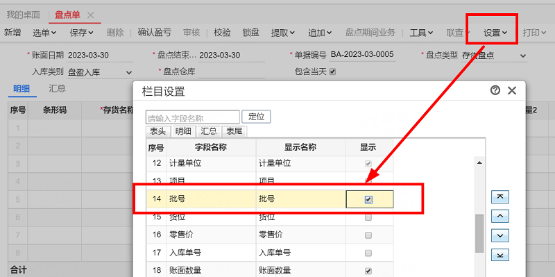 单据没有勾选显示批号字段,所以导出的盘点单模板没有批号字段。