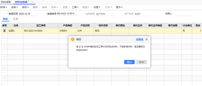 在进行生产补料补新料的时候,材料出库单保存的时候提示第【1】行材料编码在加工单中已存在该材料,不能新增材料!是否删除已存在的材料?