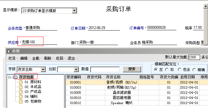 采购订单中选择供应商后,存货参照中显示供应商存货对照表中该供应商的存货,未设置对照关系的存货则不可见。