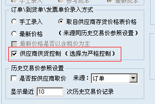 2.勾选“供应商供货控制”选项。供应链-采购管理-设置-采购选项-业务及权限控制。