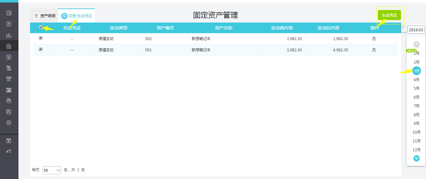 点击【固定资产-固定资产管理】,在“变更·生成凭证”页签下,找到同步更新的变动记录,勾选好,再点右上角“生成凭证”即可(注意:如果凭证模板不符合实际业务凭证,可以手工修改凭证模板,或者直接手工做原值变动凭证)
