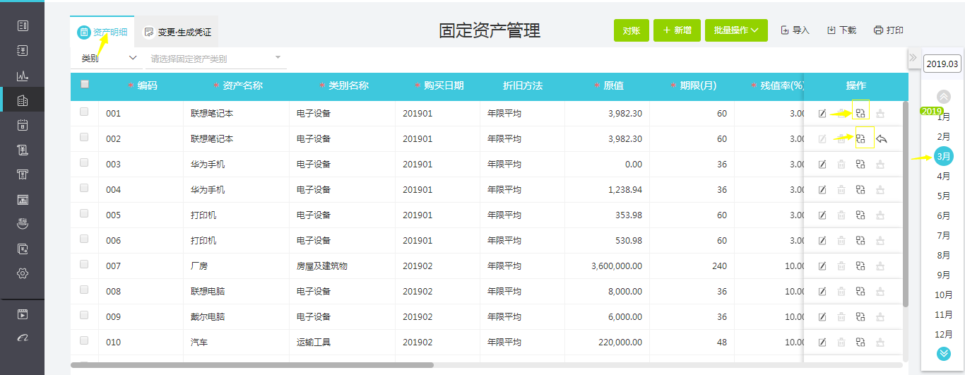 点击【固定资产-固定资产管理】,在“资产明细”页签下找到需要变动的固定资产,点击此行固定资产最右边的变动按钮进入编辑界面输入变动后的原值金额保存即可(注意:变动当月不能计提折旧)