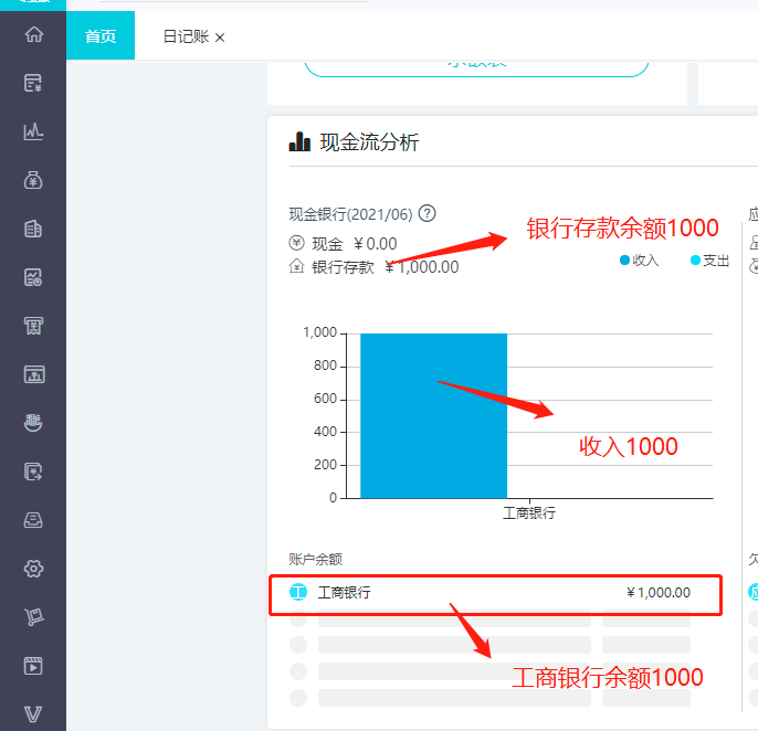 2. 现金:只要有一个现金或银行账户对应的日记账有余额或收支金额,即记录了日记账,则显示现金日记账的余额合计,点击进入余额进入第一个现金账户的日记账;否则,显示库存现金的科目余额,点击进入“1001库存现金”(民非为“1001现金”)的明细账;