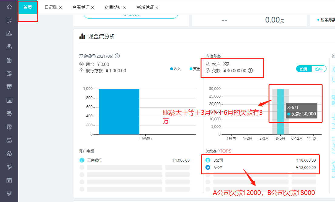 现金流是企业生存和发展的基础,在市场经济条件下,企业现金流量在很大程度上决定着企业的生存和发展能力。那么如何从财务数据中获取公司的现金流情况呢?别担心,好会计首页中不仅可以体现银行现金支出、收入及余额情况,应收账款欠款余额和欠款客户情况,还可以体现各财务流动性指标情况。