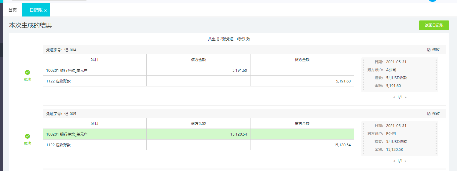 勾选需要生成凭证的流水,点击右上角生成凭证,再点击全部生成凭证,系统会根据“收支大类”和“收支类型”自动创建对应的凭证。