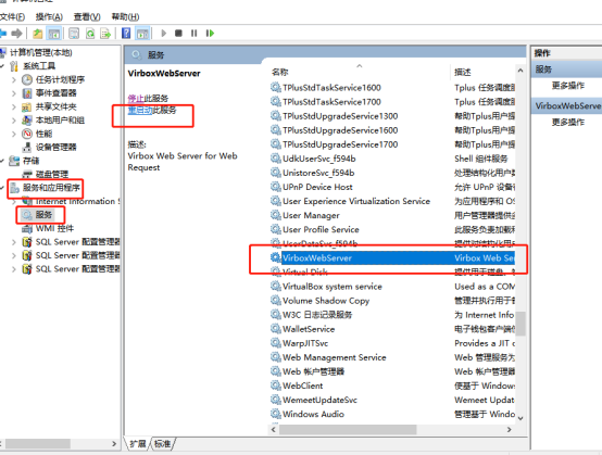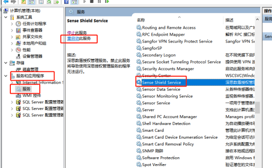 2、重启Sense Shield Service服务和VirboxWebServer服务,路径:选中此电脑或者计算机,单击右键,点击【管理】-【服务和应用程序】-【服务】,右边找到这个服务重启,如图所示