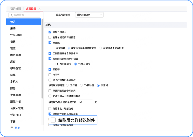 增加【结账后允许修改附件】选项,勾选后业务结账是也允许修改、上传附件。