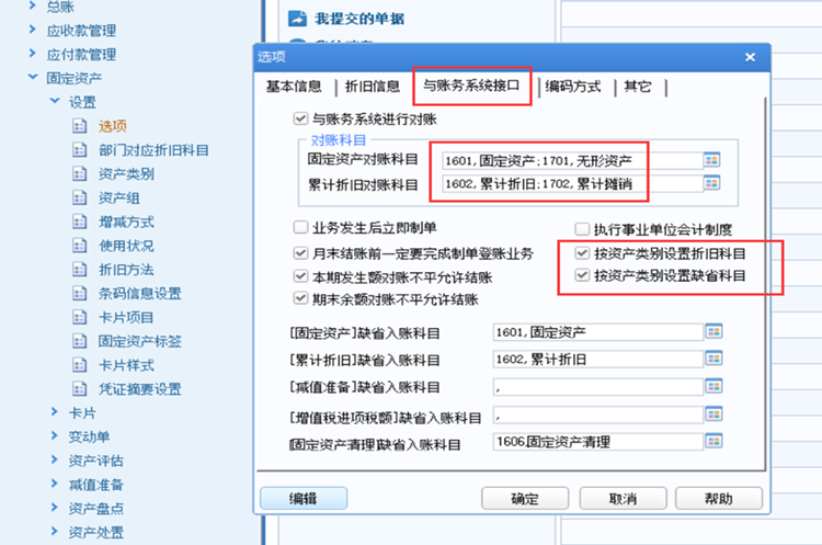 1.固定资产—设置—选项—与账务系统接口,勾上按资产类别设置折旧科目和按资产类别设置缺省科目,固定资产对账科目选则固定资产和无形资产,累计折旧对账科目选择累计折旧和累计摊销。