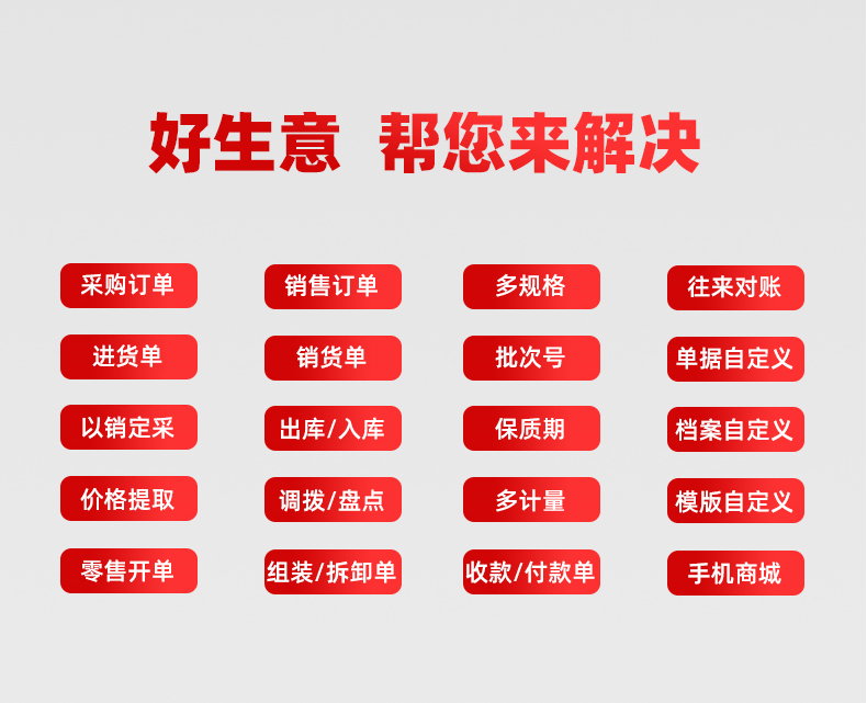 用友好生意是一款营销型进销存软件,它能够帮助企业生意记账、商品管理、仓库管理、库存管理、会员管理、销售管理、订单管理、店铺管理、财务管理等。它的特点是方便商家收银、订货、采购、开单、出入库、记账、对账、订单跟踪、盘点、核算、客户crm、多仓云库房管理等,是一款非常实用的管理软件。