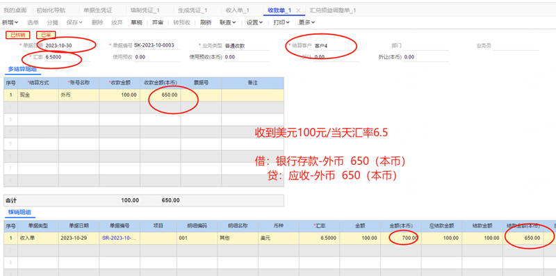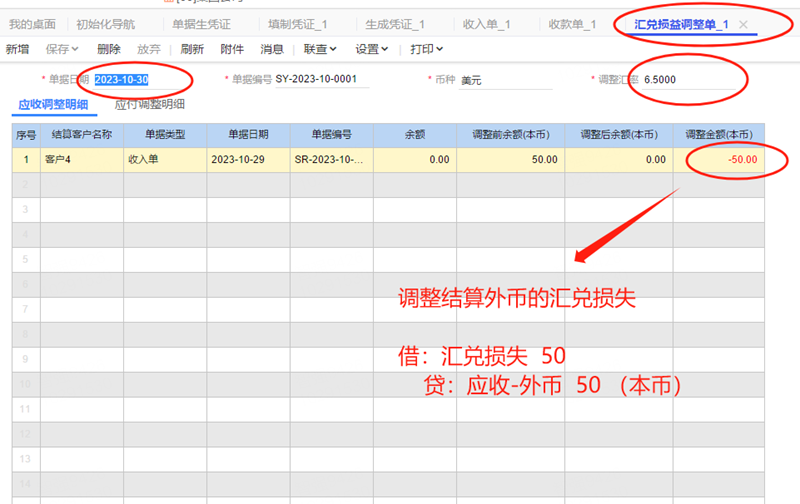 问题1:10月30号收到服务费100美元/当天汇率6.5元,要做【汇兑损益调整单】调差