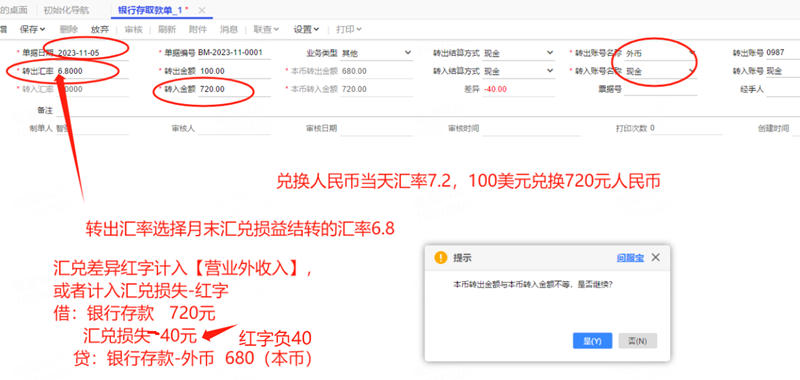 问题3:11月5号将美元兑换成人民币/当天汇率7.2元,要做【银行存取款单】调差