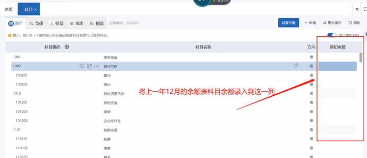 1.若是1月份启用的,那么直接在【期初余额】中录入上年末12月的科目余额: