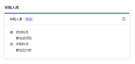 当采购流程为分开流程,即进货和入库是分开进行的时候,采购入库单生成凭证为借:存货科目 暂估进项税 贷:采购科目 暂估应付款