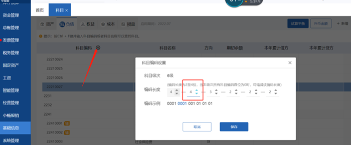 1.点击【基础信息】-【科目】,鼠标点击【科目编码】四个字后面的【齿轮】图标,修改科目编码级次后点击【保存】:例如二级科目已经到了99个无法再新增时,将二级科目编码长度调整为3或者4;
