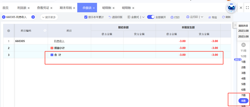 查询可知,8月的余额表里,并没有记录利息收入有发生额