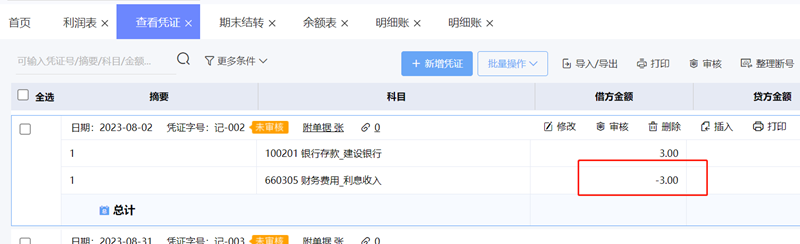 进入明细账可知,一正一负数,相互抵消了。本期不会记录这笔利息收入,想和利润表利息费用核对时,很难核对到这笔金额。