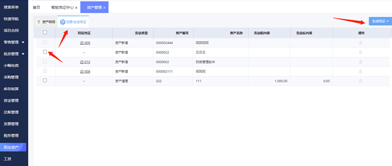 进【固定资产-资产管理】,在“变更·生成凭证”页签下,找到同步“资产新增”更新的记录,勾选好,再点右上角“生成凭证”即可。