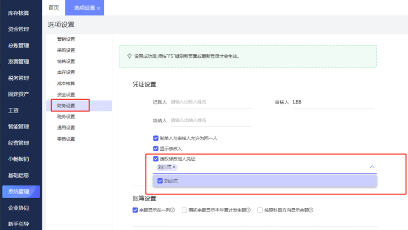 ② 在选项设置中开启允许他人修改凭证的设置并勾选会计角色用户。