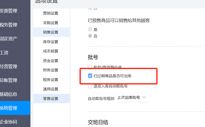 3、系统管理-选项设置-零售设置开启【已过期商品是否可出库】;