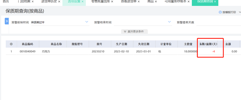 2、查看库存核算-保质期查询,检查该商品是否过期;