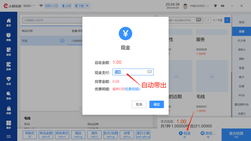 然后POS端重新登陆,收银时现金结算即可自动带出应收金额(即现金支付金额)。