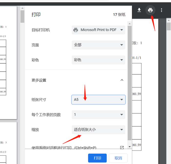 在进入打印预览界面选择右上角的打印机,出现一个预览界面,选择好目标打印机,点更多设置,纸张选择A5纸张,缩放选择一下适合纸张大小