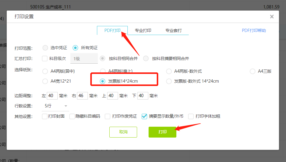 在【总账】-【查看凭证】界面选择凭证,点击【打印】,【PDF打印】,打印模板勾选【发票版14*24cm】点击打印。