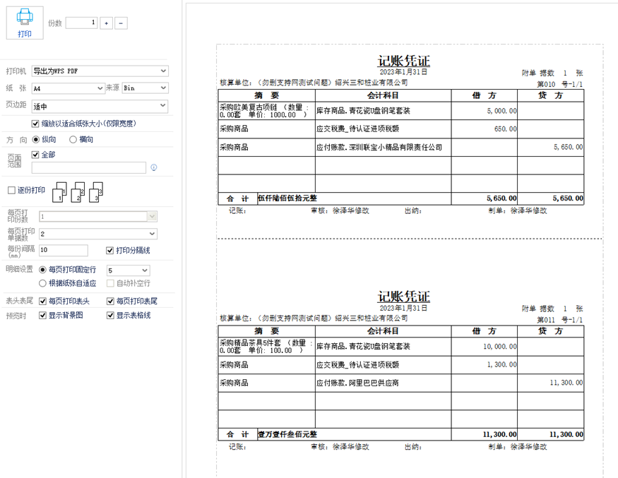 ①依次点击【总账】-【查看凭证】,点击打印,进入打印设置界面,选择PDFA4两版(居中),进行打印。