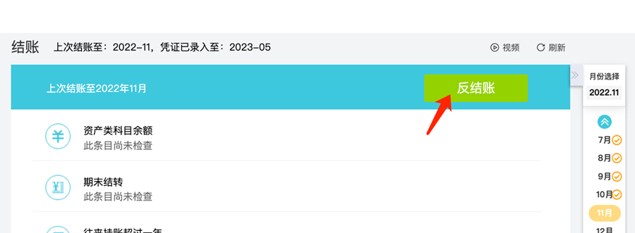 1.依次点击【结账】—【结账】,右边栏筛选期间,点击反结账。