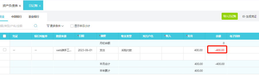 注意:日记账模块的数据要手动录入,日记账的数据需要另外录入,手动填写的有关库存现金和银行存款的凭证,不会自动同步到日记账模块,只能先导入日记账,再日记账生成凭证