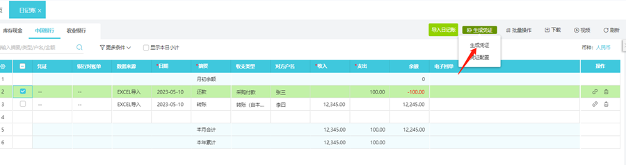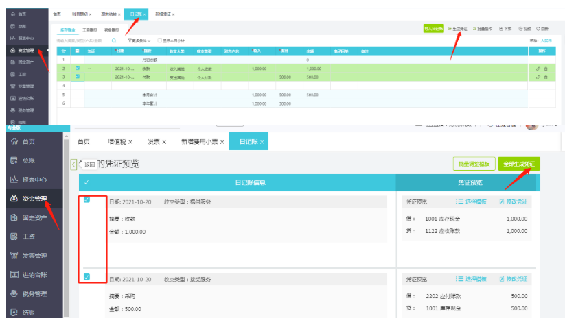 1.在【资金管理】-【日记账】的界面,勾选某条日记账记录,点击右上角【生成凭证】: