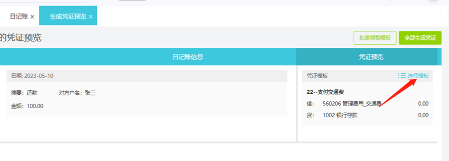 2.在弹出的【生成的凭证预览】界面,点击右上角【选择模板】: