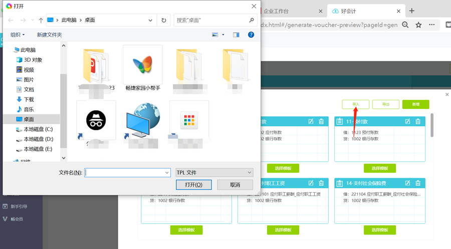3.软件进入【设置凭证模板】的界面,点击右上角【导入】按钮,自动查找模板界面,默认导入的格式是TPL格式: