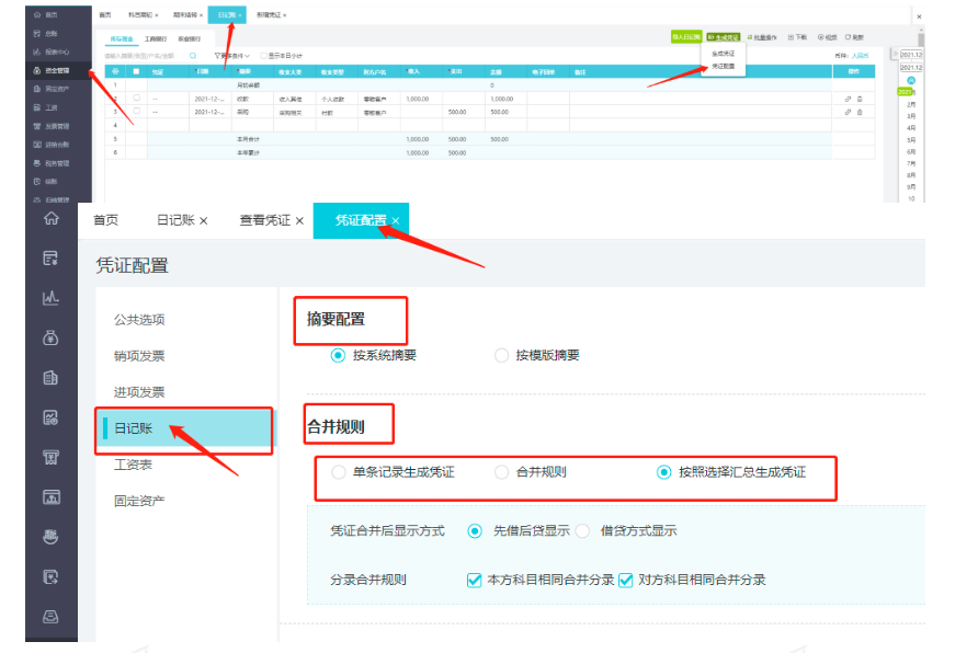 第一步:可在【日记账】-【生成凭证】-【凭证配置】中选择摘要配置及凭证合并规则,比如可以将多条日记账统一生成在一张凭证上等。