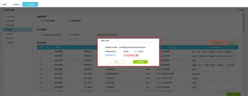 2、进入日记账凭证配置界面,收支类型设置-点击【更新配置】按钮即可按照需求选择【基础版】和【高级版】收支类型,选择好后点击【立即更新】。系统预置的数据说明表可看到基础班和高级版的区别。