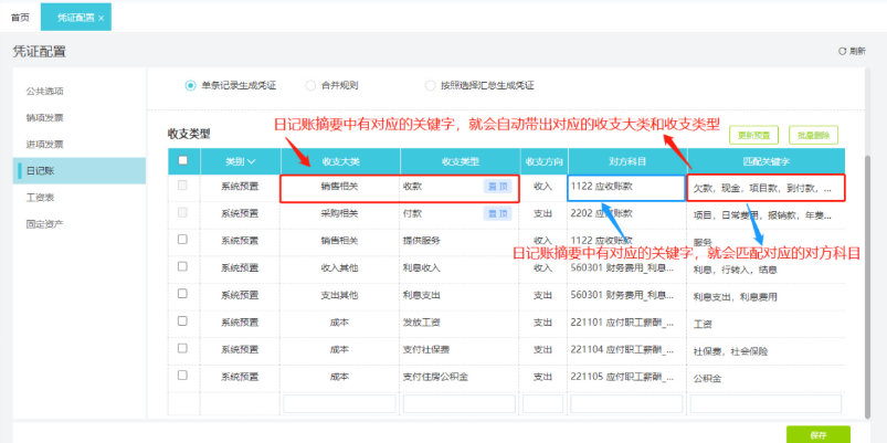 3、日记账的收支大类有八类:销售相关、采购相关、收入其他、支出其他、成本、费用报销、资金周转-支出、资金周转-收入。收支大类不可设置新增,收支类型可以新增。如需新增收支类型可点击【资产管理】-【日记账】,点击右上角【生成凭证】-【凭证配置】,拉到最后一行即可直接新增【收支类型】
