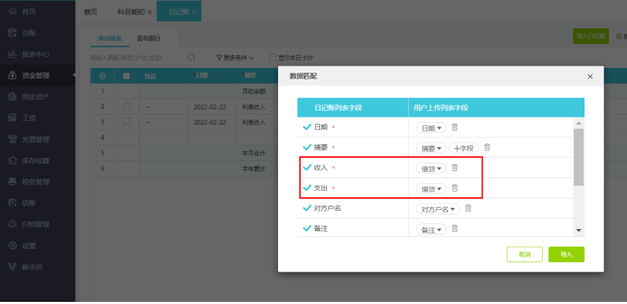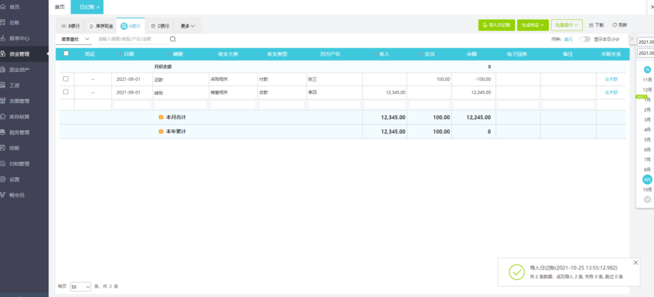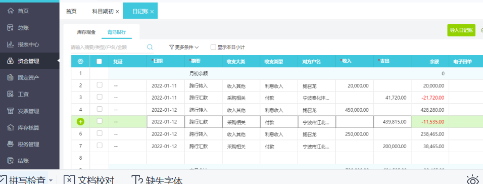 点击【资金管理】-【日记账】,在日记账界面,点击右上角【导入日记账】按钮,