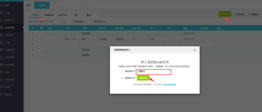 ②如果有银行流水对账单,可直接选择对应账户进行导入文件即可,支持特殊样式银行账单导入如图:
