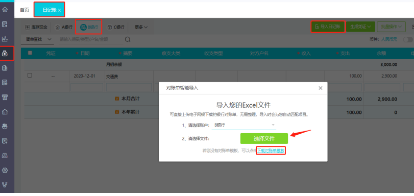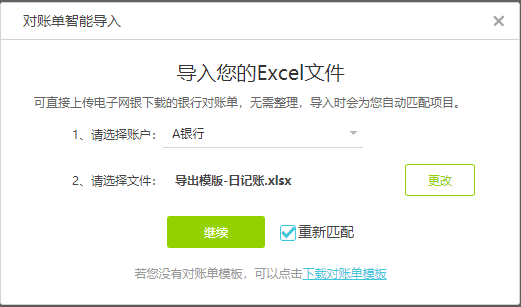 ①如果无银行网银流水,先下载对账单模板然后按照模板编辑导入文件,编辑好以后导入。