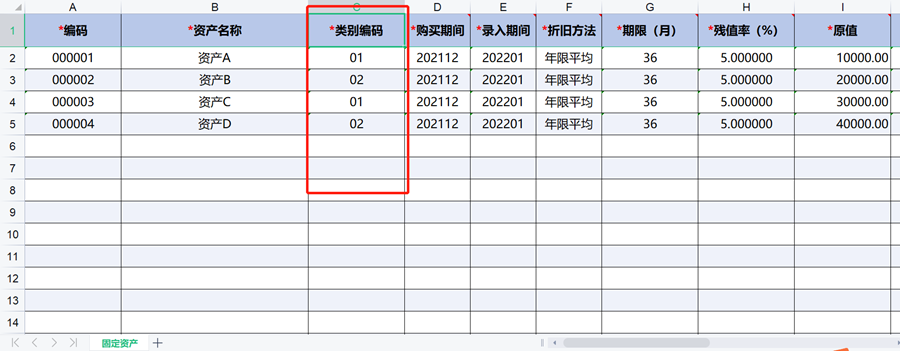 1.导入固定资产时,有一列“类别编码”是必填项,需要填写上去,