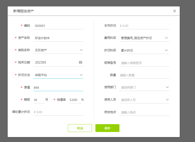 2、在【固定资产】—【固定资产管理】处就可以新增无形资产,类别名称可以选到无形资产