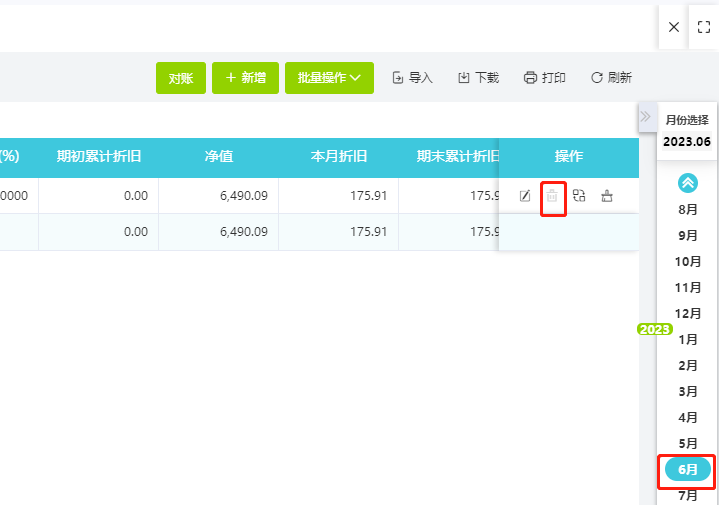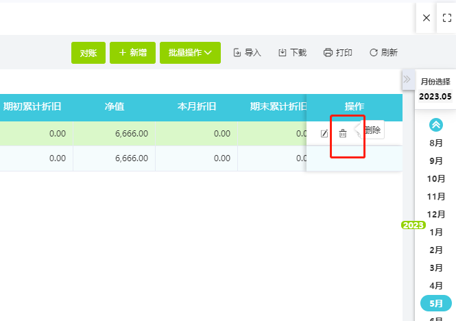 此时需要反结账到对应的月份进行删除,或者在当前的月份做资产清理。