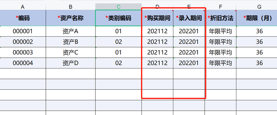 导入固定资产Excel模板中,录入期间必须大于等于购买时间,如果出现录入时间小于购买时间,导入不成功。录入期间是指固定资产卡片再系统的录入时间,购买时间就是卡片的购买日期。