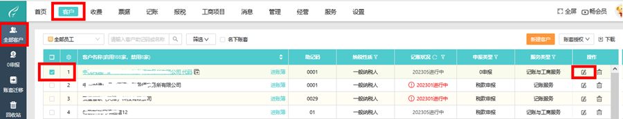1、先用管理员角色登录易代账网页端,点击【客户】-【全部客户】,找到需绑定老板端手机号进行查账的账套,鼠标点击最后面的客户资料编辑键;