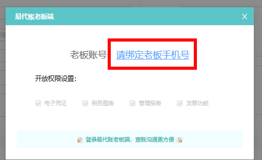 2、进入了账套资料信息界面,点击右上角【老板端设置】,输入老板的手机号进行绑定;