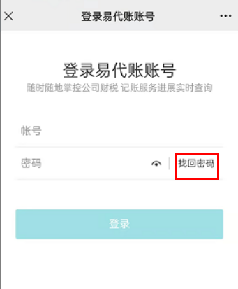 3、绑定老板端账号后,微信关注【畅捷通易代账】公众号,点击【代账工具】-【老板查账】页签输入老板的账号密码,若当时没有设置密码时可点击找回密码进行设置;