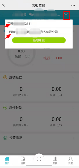 4、输入完老板账号密码后,可点击倒立的三角,进行切换账套,选择要查询的税表等,便于查账。
