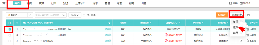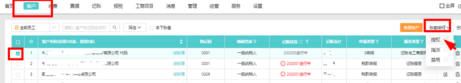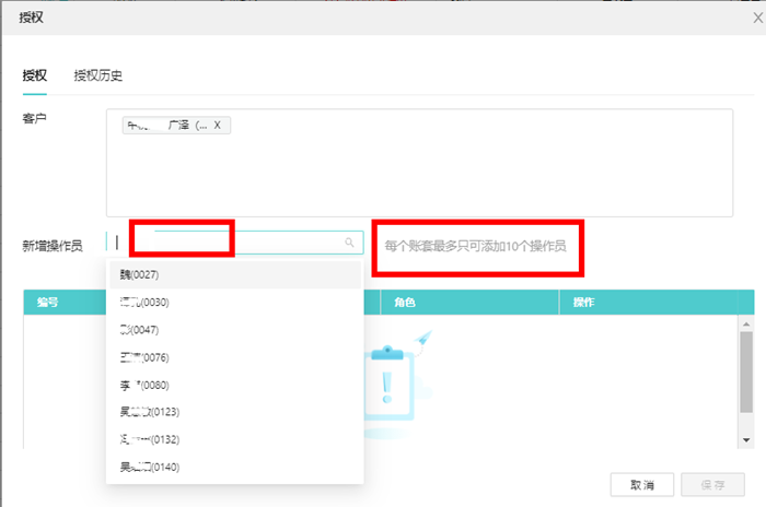 1.易代账【工作台】-【客户】,选择某个或多个账套授权,在【新增操作员】中选择对应的授权会计后点击【保存】即可,一个账套最多可授权10人;