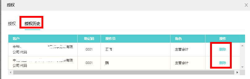 Ps:如果需要取消授权,可点击右上角【授权历史】,点击对应人员点击【删除】。