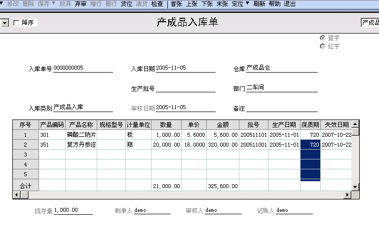 二、产成品入库单